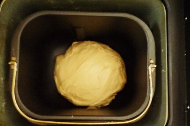 1.除黄油外的所有材料(依次放牛奶,蛋液,糖,高筋粉和低筋粉,再在面粉上面挖一个小洞,放酵母后盖上)放入面包桶。启动一个和面程序。(150克牛奶放在这里)