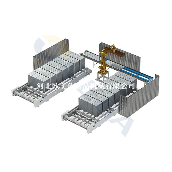 用于汉堡热狗生产线吐司生产线。一台机器人负责2台可移动式链板烤盘库,在开机生产时连续自动从烤盘库抓取烤盘放在输送线上。在停止生产时自动连续收集烤盘放在可移动链板输送机上。
